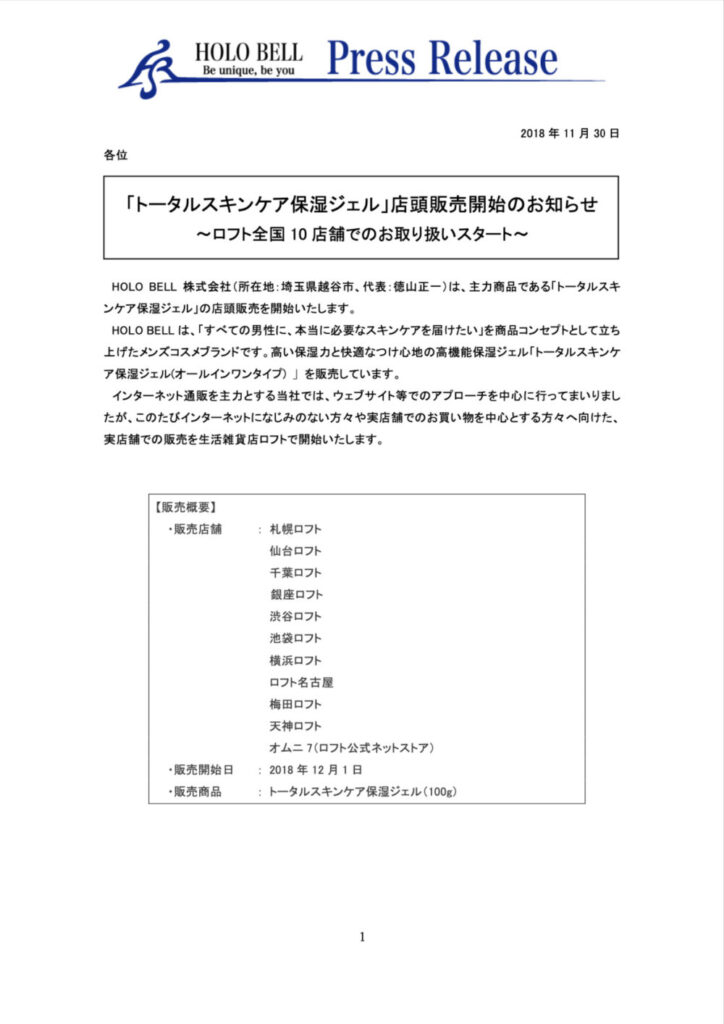 また、HOLO BELLからは下記Press Releaseが出ており、販売店舗に電話して「3in1保湿シャンプー」が売っているか確認しました。